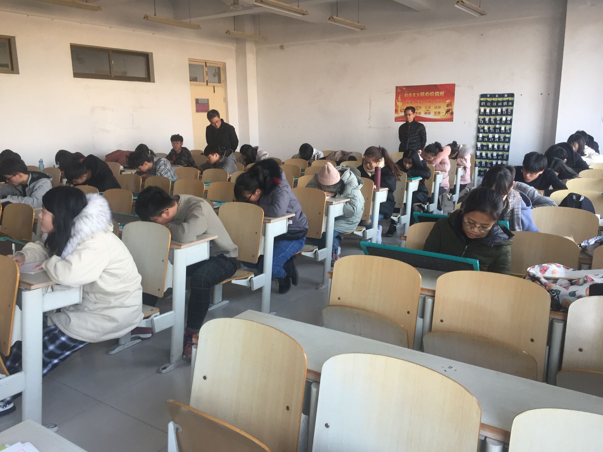 比赛前,各班优秀代表在比赛场地等待,由赵庆福书记在物理学各班随机抽取5人参加比赛,旨在全面考察师范生的字体功底,有利于师范生将来的就业和发展。当荆莉老师宣布比赛正式开始时,同学们满怀激情,用心书写每一笔笔画、每一个汉字,尽其所能地展示自身书法的才能。接下来,由评委老师认真审阅,选出一等奖3名,二等奖6名,三等奖9名,获奖作品中无不透着或规范、或严谨、或灵动的气质。
